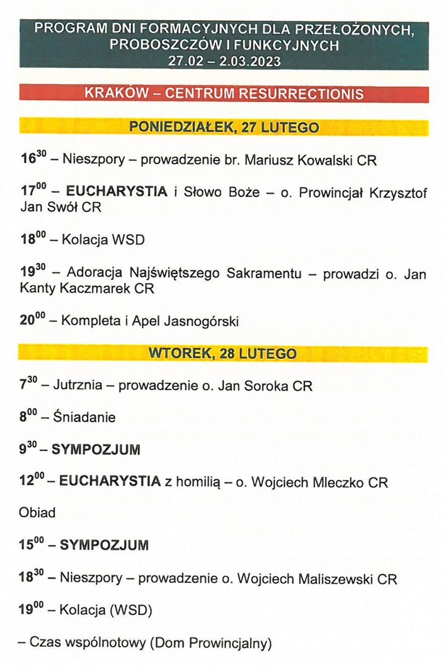 Zwyczajowo już, w pierwszym tygodniu Wielkiego Postu (od 27 II do 02 III 2023 r.), odbył się w Krakowie zjazd przełożonych, proboszczów i funkcyjnych z Polskiej Prowincji Zmartwychwstańców. Był to czas wzmacniania więzi wspólnotowych, dzielenia się doświadczeniem posługi, oraz wyzwaniami jakie stawia nam życie, ale także czas modlitwy i zgłębiania świadomości zakonnej. Wszystkim uczestnikom zjazdu życzymy, aby minione spotkanie było dla naszych wspólnot darem prawdziwego błogosławieństwa w naszych posługach i przedsięwzięciach.