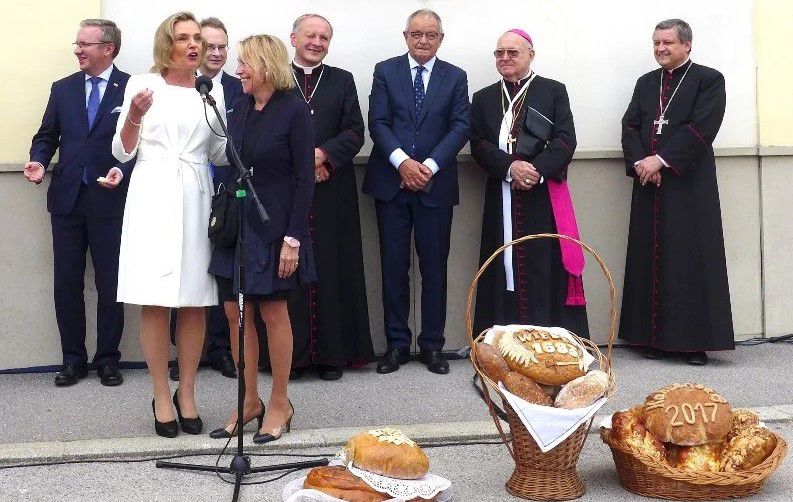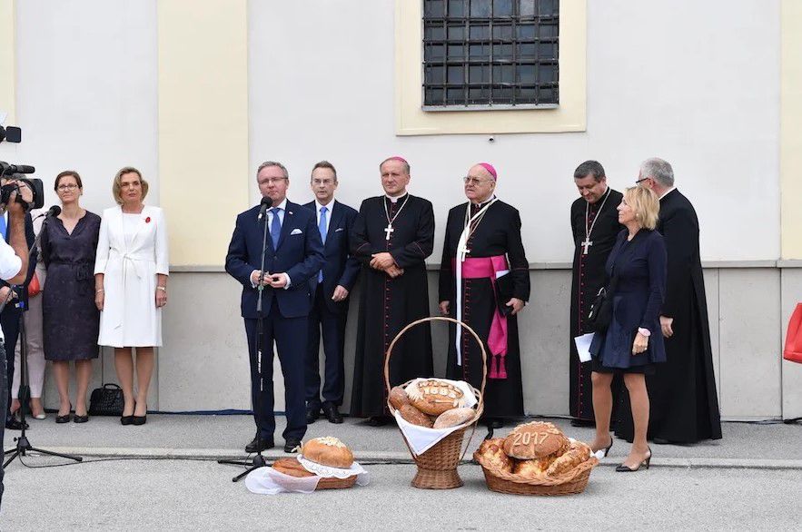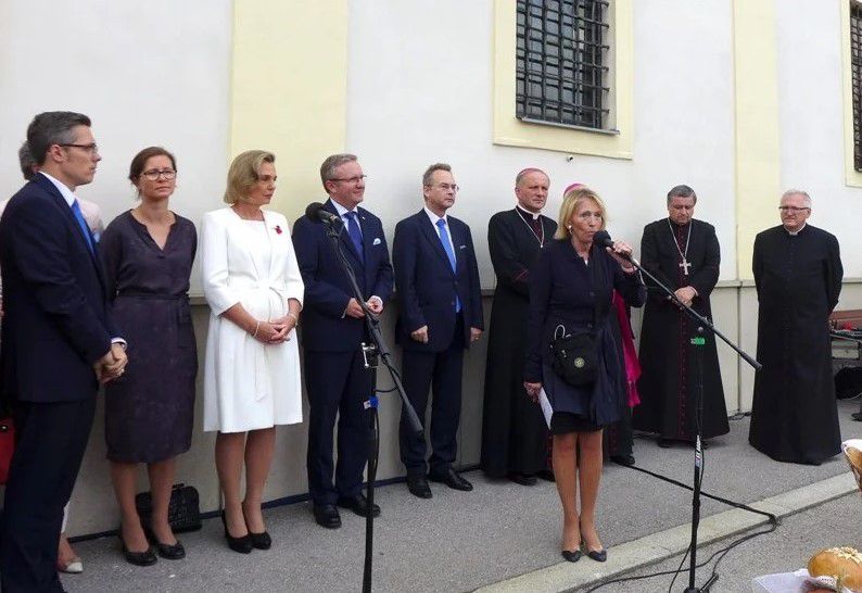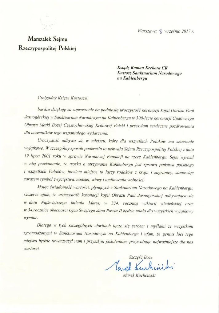Po Mszy św. gości i tłumnie przybyłą Polonię powitali gospodarz uroczystości ks. rektor Roman Krekora CR i charge d’affaires Monika Szmigiel-Turlej. Minister Szczerski przekazał przesłanie od prezydenta Andrzeja Dudy: „Chciałbym serdecznie pozdrowić wszystkich Państwa od Pana Prezydenta Andrzeja Dudy i podziękować za Państwa obecność na Kahlenbergu i opiekę nad tym wyjątkowym miejscem, które można nazwać latarnią polskiej dumy narodowej w Austrii. Jest to szczególne miejsce dla Polaków i dla Polski. To miejsce świadczy o wspomnianym podczas kazania polskim czynie, który zawsze wyrastał z głębokiej wiary, ponieważ polski patriotyzm jest osadzony w wierze i w ufności w Opatrzność Bożą i Opiekę Matki Boskiej” – mówił minister.